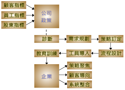 策略聚焦(strategy focused), 顧客導向(customer centric), 系統整合(system integrated)的卓越組織,以提升企業整體運作效益。
