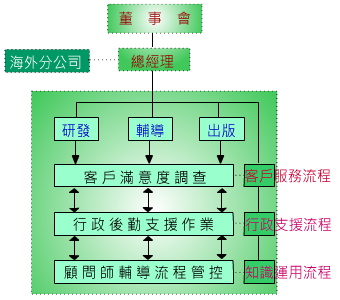 進階管理系統整合顧問公司的組織設計,是以顧客為導向做基本架構,因此,組織採用流程而不採用部門,每一流程設有流程負責人,作為該流程績效之實現責任者,以確保服務核心能力的有效發揮。