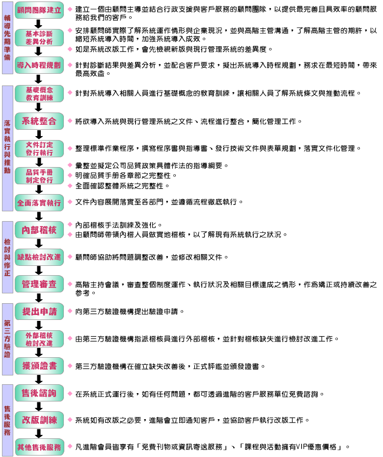 進階除了擁有堅強的顧問師陣容,並結合行政支援與客戶服務,規畫出完善之輔導流程,務求為客戶帶來最大的輔導效益,您可透過來電或來信的方式,向我們表達您的需求,抑或是直接於網站上填寫需求表,進階將會以最親切、最迅速的服務,來協助企業做好管理工作。